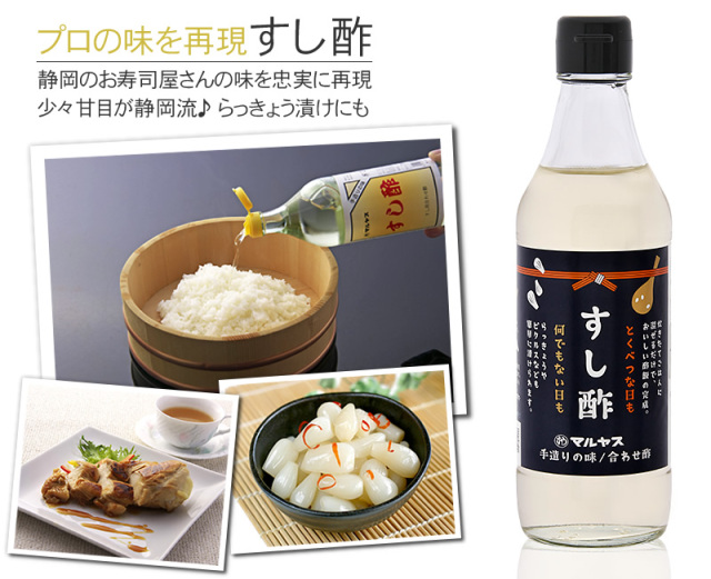 静岡の味 すし用合わせ酢『すし酢』 マルヤス印の『すし酢』は、静岡の家庭の味を再現しています。 少々甘いのが静岡流! そのまま適量を炊き立てのご飯にまぜるだけ。すし飯に使用する場合の目安は、お米1合につき『すし酢』40mlの割合です。 すし飯だけでなく『酢の物』や『らっきょう漬け』、醤油やだしと合せて『ドレッシング』などもお手軽に作ることが出来ます。 |