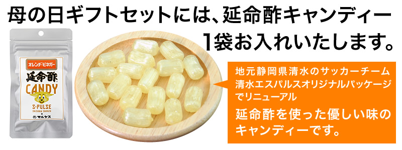 ![]() みかんのお酢 延命酢 330ml 3本セット 沖縄以外送料無料 母の日ギフト 大人気の手造りにこだわった、みかんのおいしい酢『延命酢』の330mlコンパクト瓶、母の日用ギフトセットです。 さらに、母の日メッセージカード、数量限定のカーネーション(造花)、優しい甘さの延命酢キャンディー1袋もお付けいたします。 母の日メッセージカード、数量限定のカーネーション(造花)のセットとなります。 カーネーションは数量限定となります。場合によっては、メッセージカードのみとなります。お早目のご注文をおすすめいたします。 メッセージカード文章は、「お母さん いつもありがとう いつまでも 元気でいてね」となります。 文章はご指定いただけません。 4月28日23時59分までのご注文は5月10日(母の日)までにお届け可能です。 ※4月29日以降のご注文は、5月11日以降順次出荷となります。 ※お届け日時のご指定がない場合は、準備でき次第最短出荷となります。 ※お届け日時のご希望がある場合、備考欄にてご指示ください。 ※遠方地方(北海道・九州・沖縄・離島等)にお届けの場合は配送日数がかかりますので、余裕を持ってなるべくお早めにご注文ください。 ※天候や交通事情によりお届けが遅れる場合もございますことを予めご了承ください。 ※ギフト専用化粧箱ですので、包装紙での包装はいたしません。 【延命酢について】 マルヤスの延命酢は、静岡産のみかん果汁を原料に酢酸発酵させた果実酢と米酢とはちみつなどを加えたおいしい酢です。 「100年先まで大切に残していきたい」と思う商品を市民が選ぶ、静岡市の逸品「しずおか葵プレミアムアワード2019」にて、延命酢が、静岡市の地域ブランドとして認証されました。 ※「延命酢330ml」は第15回調味料選手権2024 酢部門 最優秀賞を受賞しました。 【延命酢キャンディーについて】 缶入りで人気だった延命酢ドロップスをお客様の声を元に改良しました。 地元静岡清水のサッカーチーム、清水エスパルスパッケージになりました。 延命酢の味をさらにお楽しみいただくために、原料に使用する分量を増やしましたので、延命酢の優しい酸味と甘味をより感じられるようになりました。 さらに、持ち運びに便利なチャック付きの袋ですので、バッグの中に入れて、いつでもどこでもお楽しみいただけます。 延命酢についてのご注意点 ※延命酢は、天然のはちみつや、静岡産みかんの果汁を原材料に製造し保存料等を使用しておりません。その為、開封後は必ず冷蔵庫に保存し、賞味期限にかかわらずお早めにお召し上がりください。 ※みかんの繊維が混ざることがありますが、品質上問題はありません。 ※原材料に蜂蜜を使用していますので、1歳未満の乳児には与えないでください。 |