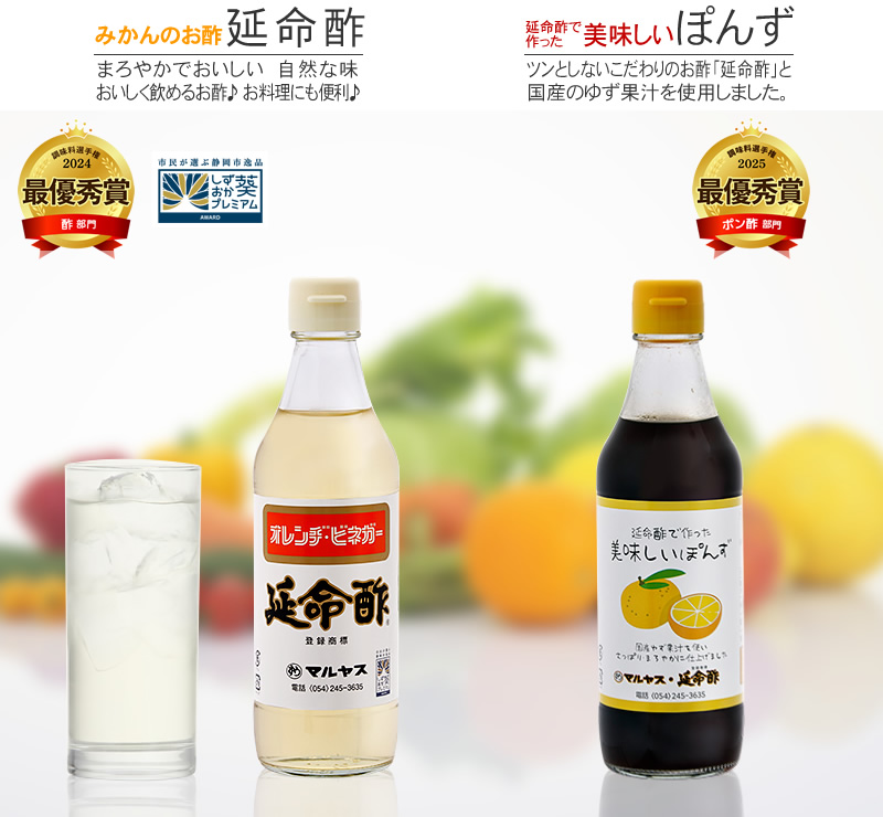 ![]() 延命酢330ml2本・延命酢で 作った美味しいぽんず 330ml1本セット 沖縄以外送料無料 母の日ギフト 大人気の手造りにこだわった、みかんのおいしい酢『延命酢』と、国産ゆず果汁がうれしい『美味しいぽんず』二種類の330mlコンパクト瓶、母の日用ギフトセットです。 さらに、母の日メッセージカード、数量限定のカーネーション(造花)、優しい甘さの延命酢キャンディー1袋もお付けいたします。 母の日メッセージカード、数量限定のカーネーション(造花)のセットとなります。 カーネーションは数量限定となります。場合によっては、メッセージカードのみとなります。お早目のご注文をおすすめいたします。 メッセージカード文章は、「お母さん いつもありがとう いつまでも 元気でいてね」となります。 文章はご指定いただけません。 4月28日23時59分までのご注文は5月10日(母の日)までにお届け可能です。 ※4月29日以降のご注文は、5月11日以降順次出荷となります。 ※お届け日時のご指定がない場合は、準備でき次第最短出荷となります。 ※お届け日時のご希望がある場合、備考欄にてご指示ください。 ※遠方地方(北海道・九州・沖縄・離島等)にお届けの場合は配送日数がかかりますので、余裕を持ってなるべくお早めにご注文ください。 ※天候や交通事情によりお届けが遅れる場合もございますことを予めご了承ください。 ※ギフト専用化粧箱ですので、包装紙での包装はいたしません。 【延命酢について】 マルヤスの延命酢は、静岡産のみかん果汁を原料に酢酸発酵させた果実酢と米酢とはちみつなどを加えたおいしい酢です。 「100年先まで大切に残していきたい」と思う商品を市民が選ぶ、静岡市の逸品「しずおか葵プレミアムアワード2019」にて、延命酢が、静岡市の地域ブランドとして認証されました。 ※「延命酢330ml」は第15回調味料選手権2024 酢部門 最優秀賞を受賞しました。 【延命酢で作った美味しいぽん酢について】 ツンとしない、まろやかなこだわりのおいしい酢「延命酢」をベースに「国産ゆず果汁」を使用し、食材の持つ旨味や風味を消してしまわない、とってもまろやかでやさしいぽんずに仕上げました。 とても優しい味にしましたので、酸味が苦手のパパさん、小さいお子さまからお年寄りまで、家族みんなで楽しめるぽんずです。 ※「延命酢で作った美味しいぽんず330ml」は第16回調味料選手権2025 ポン酢部門 最優秀賞を受賞しました。 【延命酢キャンディーについて】 缶入りで人気だった延命酢ドロップスをお客様の声を元に改良しました。 地元静岡清水のサッカーチーム、清水エスパルスパッケージになりました。 延命酢の味をさらにお楽しみいただくために、原料に使用する分量を増やしましたので、延命酢の優しい酸味と甘味をより感じられるようになりました。 さらに、持ち運びに便利なチャック付きの袋ですので、バッグの中に入れて、いつでもどこでもお楽しみいただけます。 延命酢についてのご注意点 ※延命酢は、天然のはちみつや、静岡産みかんの果汁を原材料に製造し保存料等を使用しておりません。その為、開封後は必ず冷蔵庫に保存し、賞味期限にかかわらずお早めにお召し上がりください。 ※みかんの繊維が混ざることがありますが、品質上問題はありません。 ※原材料に蜂蜜を使用していますので、1歳未満の乳児には与えないでください。 延命酢で作った美味しいぽんずについてのご注意点 ※原料が国産丸大豆醤油のため、製造した時期により色度(色の濃さ)がかなり違う場合がございますが、品質上問題はございません。 ※原材料に保存料等を使用しておりません。その為、開封後は必ず冷蔵庫に保存し、賞味期限にかかわらずお早めにお召し上がりください。 ※延命酢の原材料に蜂蜜を使用していますので、1歳未満の乳児には与えないでください。 |